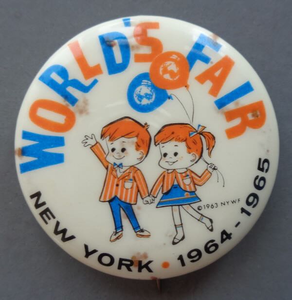 1964 New York World's Fair Pinback Button picturing the "World's Fair" children Peter and Wendy holding 2 balloons that have the Unisphere pictured on them in the center. At the bottom is "New York 1964 - 1965". "World's Fair" at the top is written in the blue and orange stylized letters. Rare. Size: 1 1/2" diameter. Condition: Very Fine, there are a several light spots under the letters and near the edge.