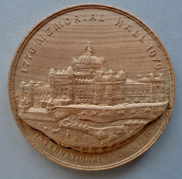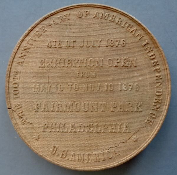 1876 Centennial Exposition Round Wooden medal with an image in relief of "1776 Memorial Hall 1876" as written above. At the bottom is "International Exposition". The back is all writing. Around the edge is "The 100th Anniversary of American Independence" with "U.S. America" at the bottom. In the center is "4th of July 1876, Exhibition open from May 10 to Nov. 10 1876, Fairmount Park, Philadelphia". Size: 3" diameter. Condition: Very Fine, there are 2 cracks in the reverse.