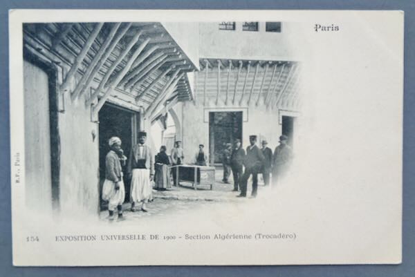 1900 Paris International Exposition Postcard Picturing "Exposition Universelle de 1900 - Section Algerienne (Trocadero)" in black and white with "Paris" written in the upper right corner. The card is numbered "154" and pictures 2 building facades and 2 men in costume. On the left is "P.F., Paris". Size: 5 1/2" wide by 3 1/2" high. Condition: Excellent.