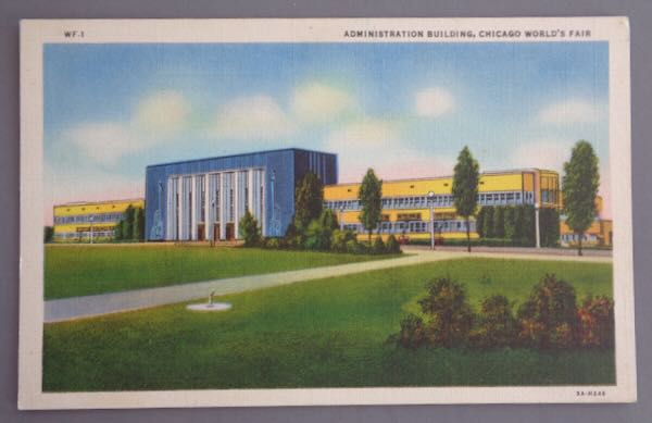 1933-34 Chicago World's Fair Unused Color Postcard "Administration Building, Chicago World's Fair" with the description of the building on reverse side. The card is numbered "WF-1" at the top left and "3A-H246" in the lower right corner. Published by "C.T. Art Colortone". Size: 5 1/2" wide by 3 1/2" high. Condition: Extremely Fine, slight damage upper right corner.