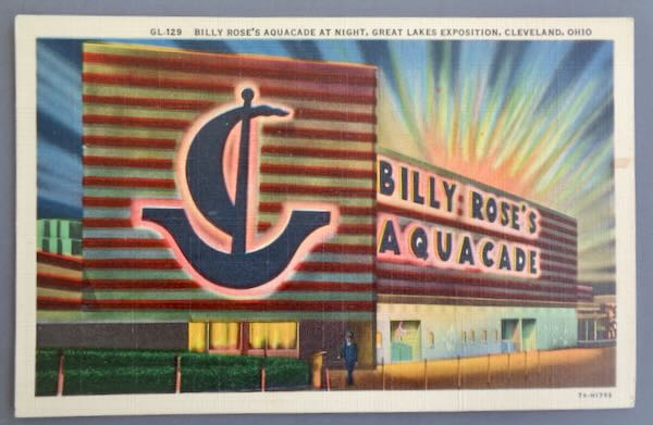 1936 Great Lakes International Exposition Unused Color Postcard for "Billy Rose's Aquacade at Night, Great Lakes Exposition, Cleveland, Ohio" numbered "GL-129" at the top and "7A-H1793" in the lower right corner. The back describes the Aquacade and was published by "C.T. Art. Colortone". Size: 5 1/2" wide by 3 1/2" high. Condition: Extremely Fine since there is a spot on the right side.