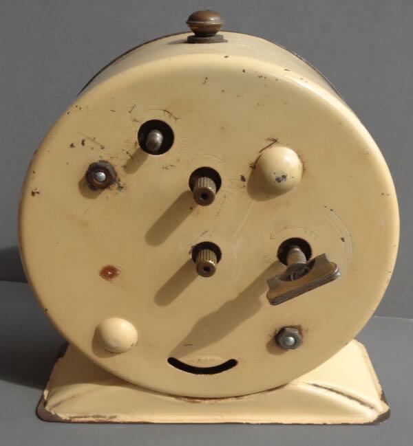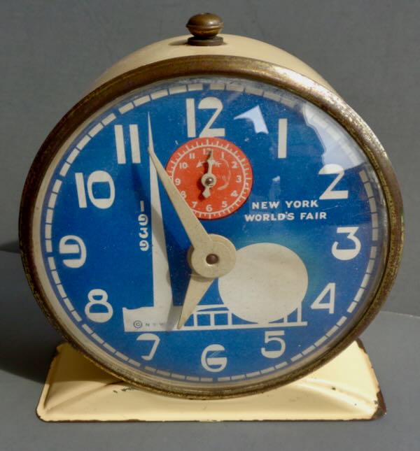 Wind up Clock with blue dial picturing the Trylon and Perisphere in white with "1939" to the left and "New York World's Fair" to the right. The base of Helicline has "© NYWF". There is a second hand in an orange circle under the '12". The clock is not marked with a maker name. The metal outside is beige. Size: 4 1/2" wide by about 2" deep (not including the wind up key) by 4 3/4" tall. Condition: Very Fine. The clock works, but the second hand does not move. There is some wear the bottom and the metal outside the dial.