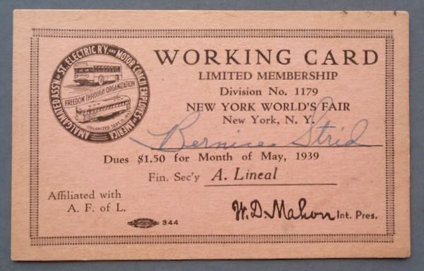 1939-1940 New York World's Fair "Working Card" "Limited Membership", "Division No. 1179", "New York World's Fair" printed in black on a pink card. In the upper left corner is the logo of the "Amalgamated Assn. of St. Electric Ry. Motor Coach Employs of America" with a bus and a tram pictured in the center along with "Freedom Through Organization" between them. The dues are "$ 1.50 for the Month of May, 1939". Size: 4" wide by 2 1/2" high. Condition: Excellent.