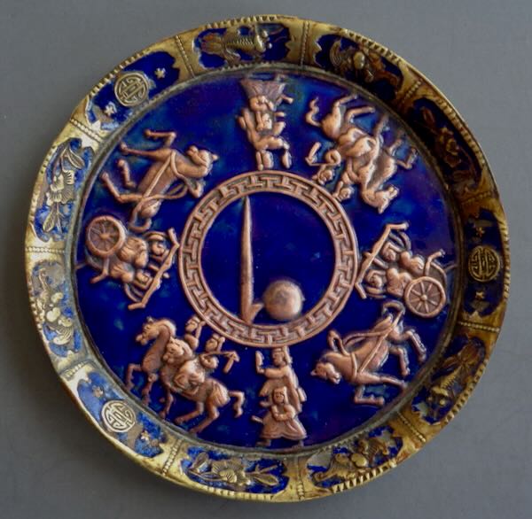 Round Brass coaster with a blue baked enamel background picturing a raised design of the Trylon and Perisphere in the center. Around the T&P are people riding horses and carriages. On the outer edge is mostly a floral design with 2 Chinese circles. The back is marked "China", "N.Y.W.F.©" and "FCO NY" inside a small 3 sided pie slice. Size: 3 3/4" diameter. Condition: Very Fine, a few spots of enamel are missing on the edge.