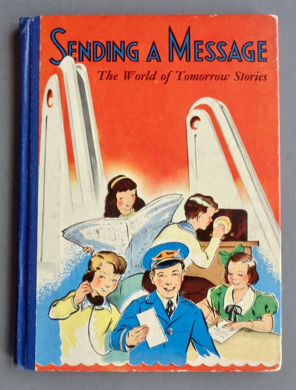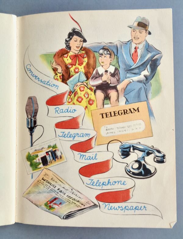 1939-1940 New York World's Fair Children's Book - "Sending a Message", part of "The World of Tomorrow Stories". "Copyright, 1939, by New York World's Fair 1939, Inc." The subtitle is "A social studies story book about Communication". This 32 page story tells about Danny's visit to the fair and how they used communication technology to send a telegram, post cards and visited the radio and television exhibit. Most of the second half of the story is about a movie about animals that Danny saw at the fair. At the end Danny and his family discuss all the methods of communications that are available to people but not the animals in the movie. The book is filled with color pictures and black and white pictures. Read this book to your child and start them early on the road to collecting World's Fair. Size: 6 1/8" wide by 8 1/4" high. Condition: Extremely Fine with light edge wear and light soiling and aging of the pages.