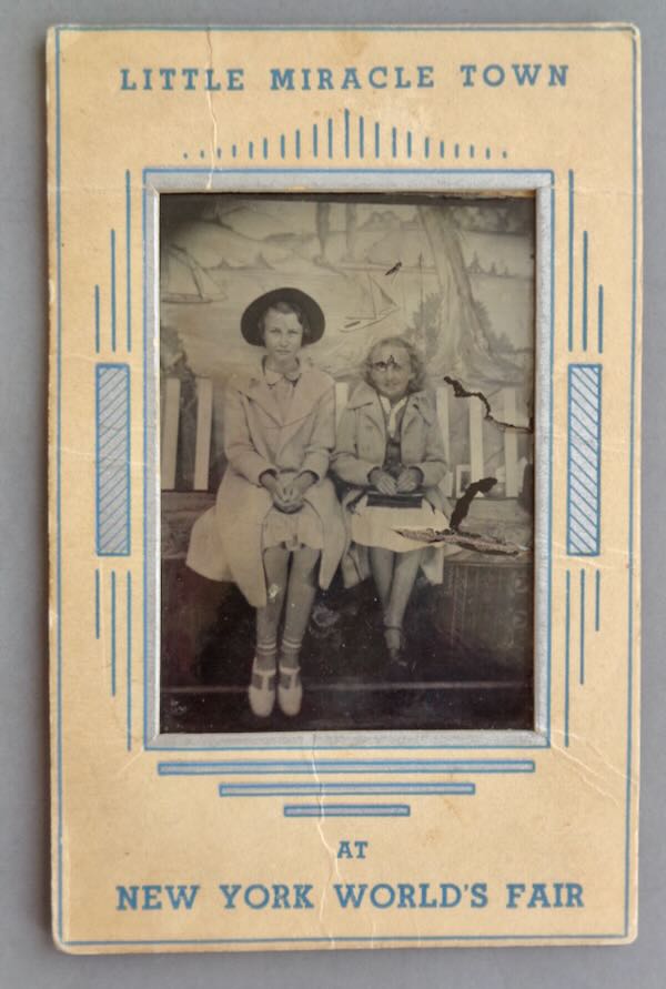 1939-1940 New York World's Fair Photograph in the original cardboard holder marked "Little Miracle Town", "at New York World's Fair" picturing 2 woman. There is blue and silver decorations on the frame. Size: 3 1/2" wide by 5 1/2" high. Condition: Fine. There are creases in the frame and 2 cracks in the photo on the right side.