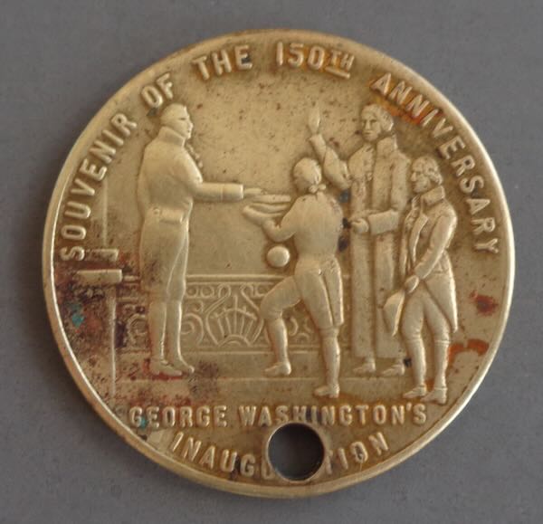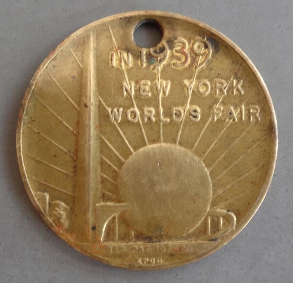 1939-1940 New York World's Fair Brass medal spinner with the obverse showing the Trylon and Perisphere in center and rays of light coming from behind it with "In 1939 New York World's Fair" at the top. On the reverse side is printed around the top edge "Souvenir of the 150th Anniversary" with "George Washington's Inauguration" at the bottom. In the center is a picture of the inauguration. There is a hole for wearing on a chain. Size: 1 1/4" diameter. Condition: Fine, the reverse is worn and the spinning doesn't work.