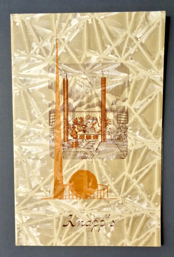 1939-1940 New York World's Fair Menu from "Knapp's" picturing a large Trylon and Perisphere in front of the Communications Building with a fancy design in silver on the background. Inside are 2 pages "Ice Cream", "Sundaes", "Fountain Suggestions", "Fruit Drinks", "Sandwiches" and more. There is also a 2 page insert of offering for "Knapp's Tea Room" on "Tuesday Oct. 1, 1940". Size: 5 1/2" wide by 8 1/2" high. Condition: Excellent with a staple rust stain on the inside. Also the insert page has uneven printing.