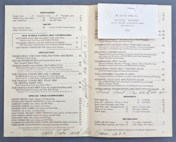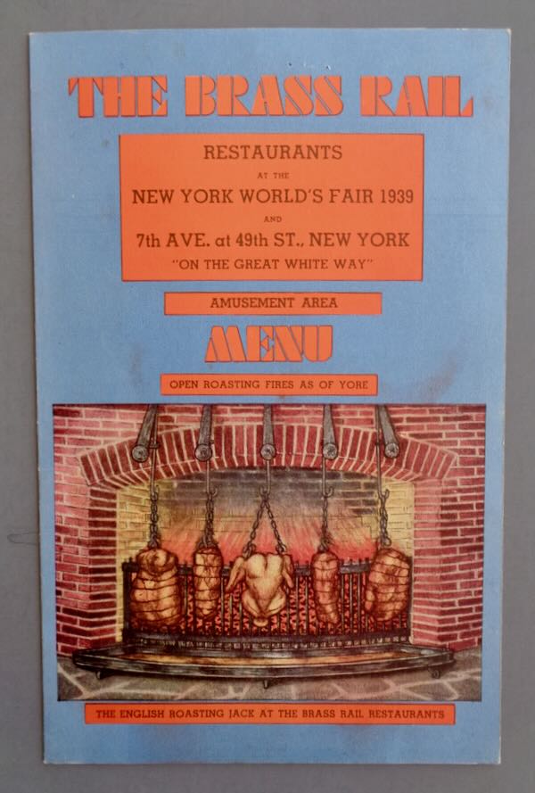 1939-1940 New York World's Fair Menu "The Brass Rail" with "Restaurants at the New York World's Fair and "7th Ave. at 49th St., New York". This is the "Amusement Area" Menu. The cover pictures in color "The English Roasting Jack at the Brass Rail Restaurants". Inside are 2 pages of their offering from 10 cents to 95 cents. There is a stapled in Special for the day and 3 hand written additions to the menu. The back cover pictures the Trylon and Perisphere and lists the 4 locations of the Brass Rail Restaurants on the fairgrounds. It has a small area at the bottom for mailing this menu. Size: 6" wide by 9 3/8" high. Condition: Excellent.