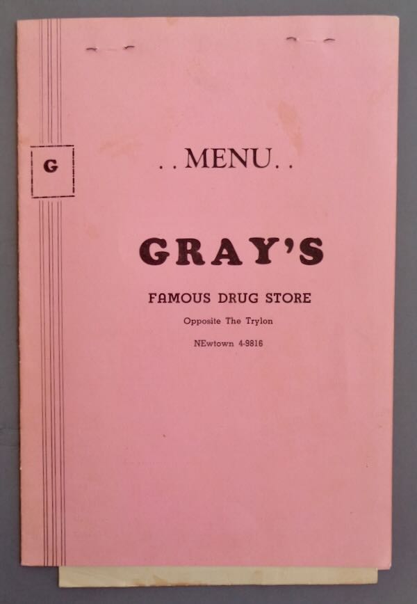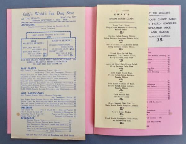 1939-1940 New York World's Fair Menu from "Gray's Famous Drug Store", located "Opposite the Trylon". Inside is a 2 page menu with 3 stapled additional menu items and choices. The prices are from 10 cents to 60 cents and include soda fountain and "Blue Plates". The back cover lists their 4 "Breakfast Specials". Size: 7" wide by 10" high. Condition: Extremely Fine, there are a few light stains.