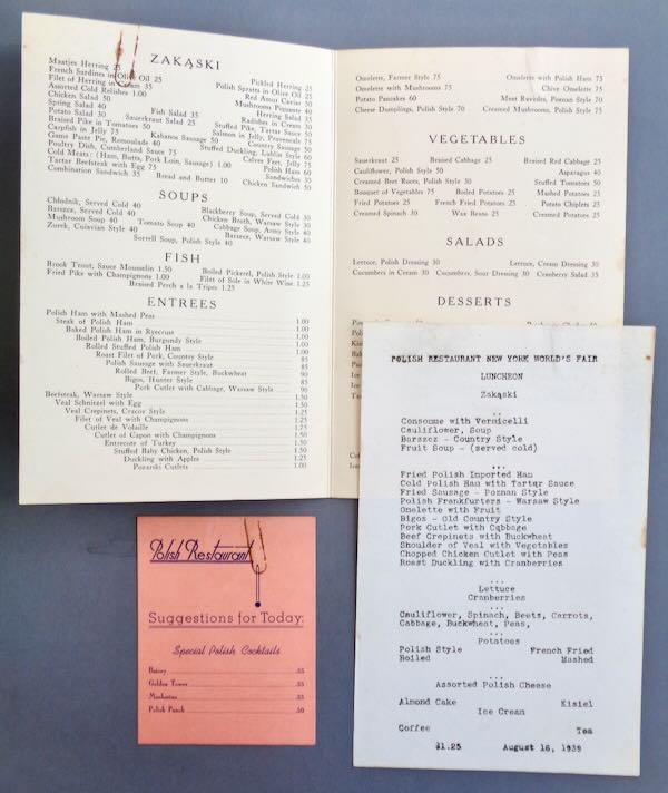 1939-1940 New York World's Fair Menu from the "Polish Restaurant at the Polish Pavilion New York World's Fair 1939" picturing a building in Poland on the cover. Inside is the regular menu along with an extra paper dated "August 16, 1939" listing the special dinner for that night. The prices on the regular menu are from 25 cents to $ 1.75. There is also an insert on a small pink thin cardboard with "Suggestions for Today", the "Special Polish Cocktails". Size: Menu is 5 1/2" wide by 8 1/2" high. Condition: Extremely Fine since there is a rust stain from a staple and stains on the back cover.
