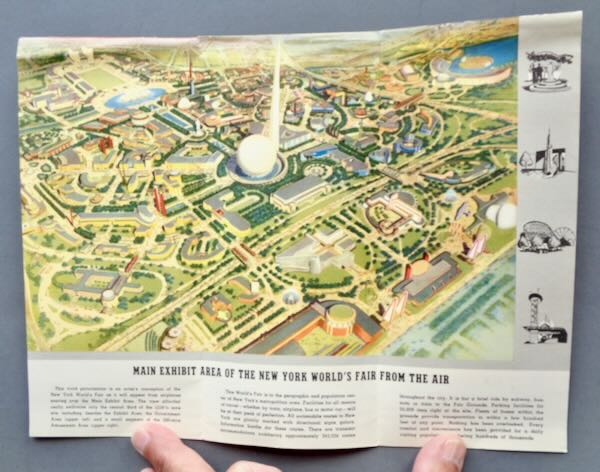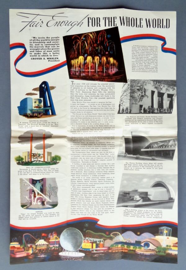 1939-1940 New York World's Fair Folder with the Trylon and Perisphere on the cover. Inside is an aerial drawing of the fairgrounds with "Main Exhibit area of the New York World's Fair from the air" written underneath. Fully open it has 3 black and white photos of buildings and 5 color drawings of buildings including the fireworks. Size: Closed: 3 7/8" wide by 8 15/16" high. Opens to: 11 1/2" wide by 17 3/4" high. Condition: Extremely Fine with a little bend at the top and slight edge wear.