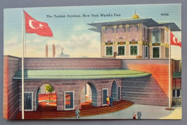 1939-1940 New York World's Fair Unused Multicolor Postcard of "The Turkish Pavilion. New York World's Fair" pictured is the building with 2 Turkish flags in the front. The postcard is numbered "WF60" on the front and "66905" on the back. It was published by "Tichnor Brothers Inc." Size: 5 7/16" wide by 3 7/16" high. Condition: Excellent.