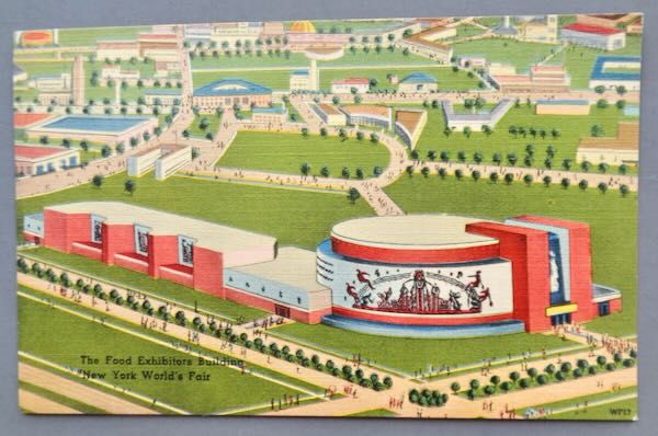 1939-1940 New York World's Fair Unused Multicolor Postcard of "The Food Exhibitors Building New York World's Fair" picturing the building with its mural and other structures behind it. The postcard is numbered "WF17" on the front and "64997" on the back. It was published by "Tichnor Brothers Inc." Size: 5 3/8" wide by 3 3/8" high. Condition: Excellent with tiny wear lower right corner hardly worth mentioning.