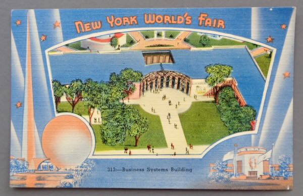 1939-1940 New York World's Fair Unused Multicolor Postcard of "313 - Business Systems Building" with the picture surrounded by a blue border with the Trylon and Perisphere in Orange on the left, the Administration Building in the lower right corner and "New York World's Fair" written across the top. The postcard is numbered "313" on the front and "65025-5" on the back. It was published by "Tichnor Brothers Inc." Size: 3 3/8" wide by 5 3/8" high. Condition: Extremely Fine tiny paper loss near lower right corner..