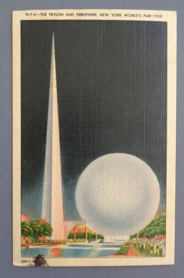 1939-1940 New York World's Fair Unused Color Postcard of "W.F.4 - The Trylon and Perisphere, New York World's Fair 1939". On the back is "Officially Licensed". Published by "Manhattan Postcard Publishing Co.". Size: 3 1/2" wide by 5 1/2" high. Condition: Very Fine with a stain on the bottom left and pencil writing on the back.