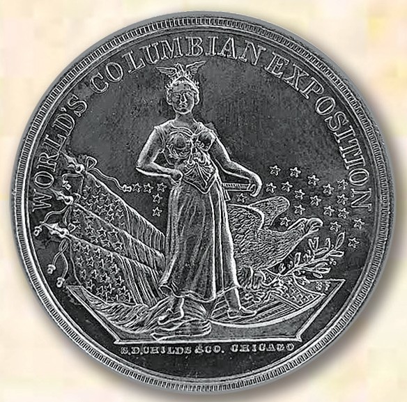 1893 World's Columbian Exposition Chicago Day - Aluminum, 38mm Columbia stands majestically among American flags, a proud eagle, and a partial background of stars. The reverse displays the city seal flanked by a Native American with his bow and arrow drawn, and a full sailed caravel at sea.. Clouds above comfort a sleeping baby with the date of October 9th proclaiming Columbus Day. The medal has soft, smooth, semi reflective fields and sharp details. Listed as Eglit 153, Starlust ST-eg-153, HK-168, and Shevlin SH 6-23. An R-5 which we grade as Uncirculated. Provenance - Steve Starlust Collection.
