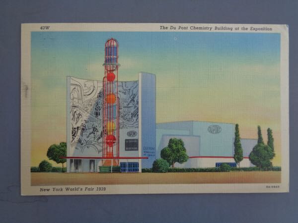 1939-1940 New York World's Fair Used Color Postcard of "The Du Pont Chemistry Building at the Exposition" and numbered "43W" in the upper left corner. In the bottom right corner is "8A-H943". The back has "Officially Approved" and a message in ink. Published by "C.T. Art. Colortone". Size: 5 1/2" wide by 3 1/2" high. Condition: Extremely Fine with a spot on the left edge and slight corner wear upper right.