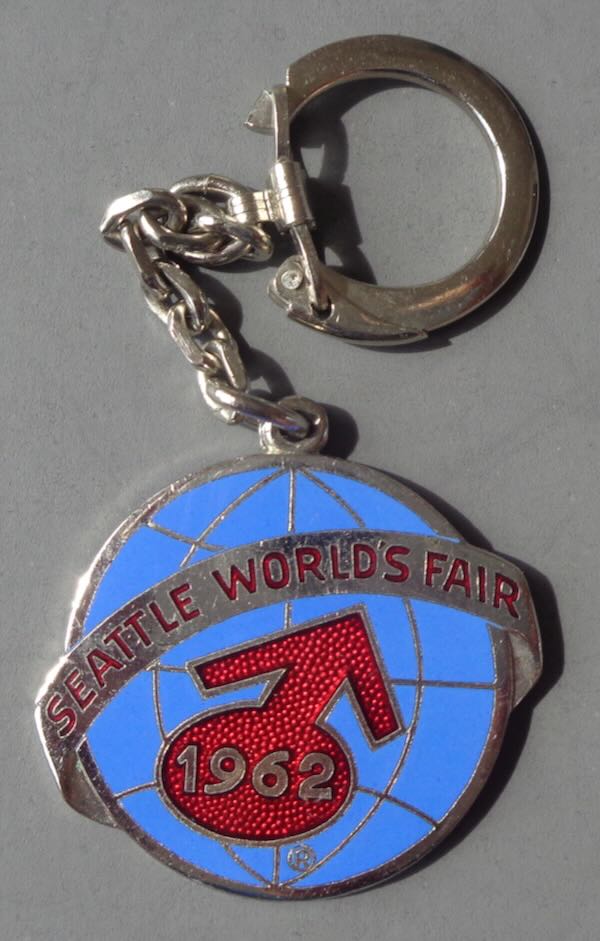 1962 Seattle World's Fair Key Chain with baked enamel disk picturing the arrow logo in red with "1962" inside and "Seattle World's Fair" written in baked red enamel through the banner above. The background is baked blue enamel. At the bottom near the center is ®. The back is marked "Made in Germany". Size: Disk is 1 1/4" wide with the overall height of 3 1/4". Condition: Near Mint.
