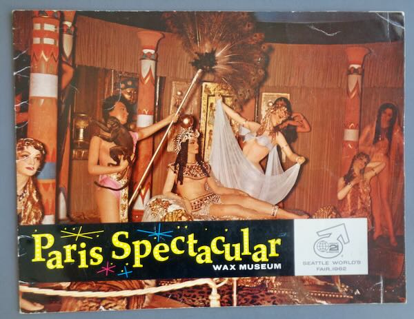 1962 Seattle World's Fair Multicolor Booklet "Paris Spectacular Wax Museum" containing 12 pages with 26 pictures and descriptions of the wax figures that are on display in this amusement exhibit. Size: 11" wide by 8 3/8" high. Condition: Very Fine, several crease on the cover. The inside is nice and bright.