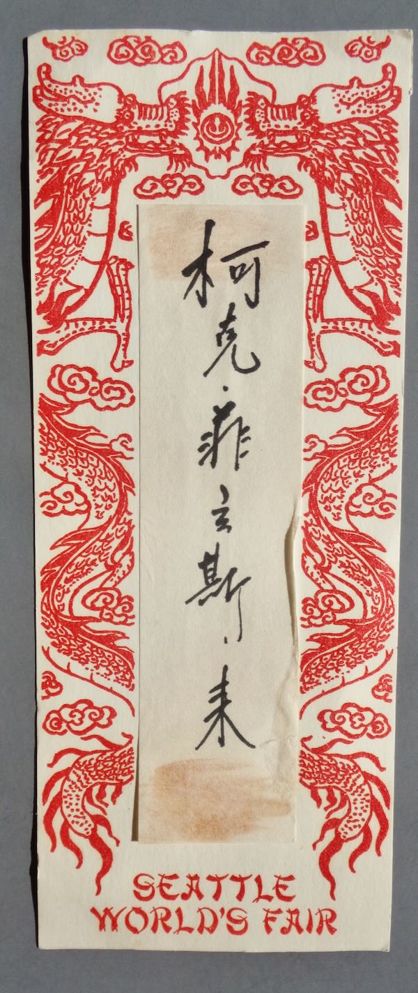1962 Seattle World's Fair Thin Cardboard souvenir from the China exhibit with Chinese writing in the center and red dragon decorations on 3 sides of the writing. At the bottom is "Seattle World's Fair". The center piece is paper attached to the cardboard. Size: 4 1/4" wide by 10 3/4" high. Condition: Very Fine. There are glue stains on the top and bottom of the paper (original glue) and a small repair of the paper on the lower right.