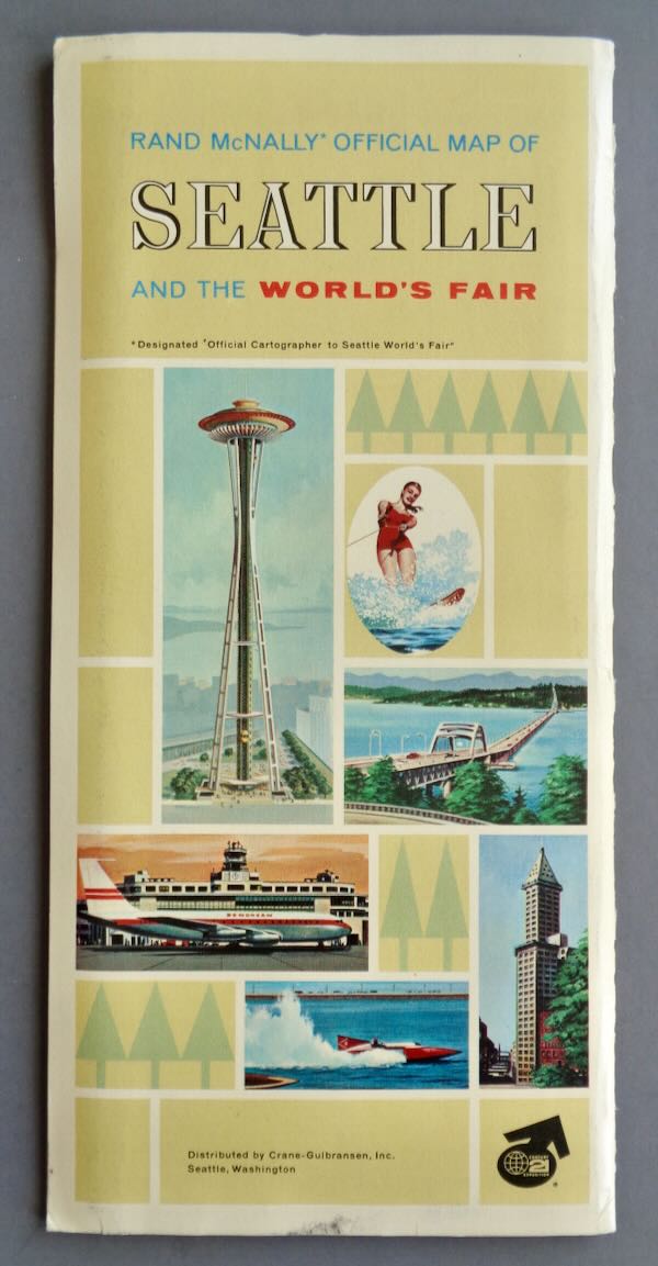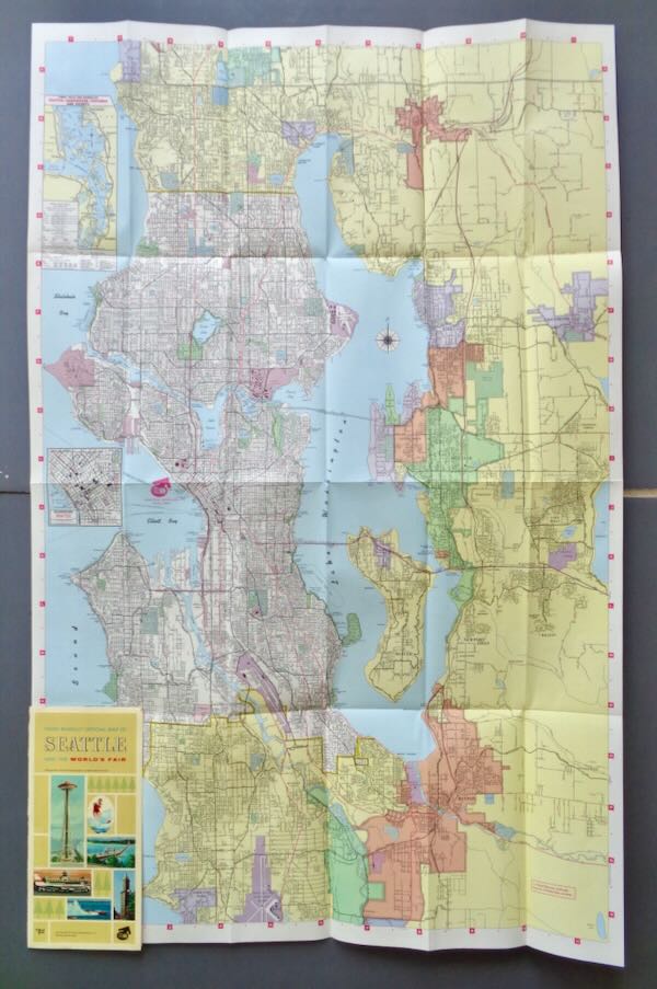 1962 Seattle World's Fair Map, "Rand McNally Official Map of Seattle and the World's Fair". Inside is a large street map of Seattle and the surrounding area with street index, a map of the fairgrounds with information about the fair and its features and a smaller map of the Seattle region. Size: Folder is 4 1/4" wide by 9 1/2" high. The map opens to 23 1/4" wide by 36 1/4" high. Condition: Excellent.