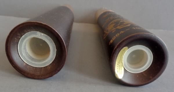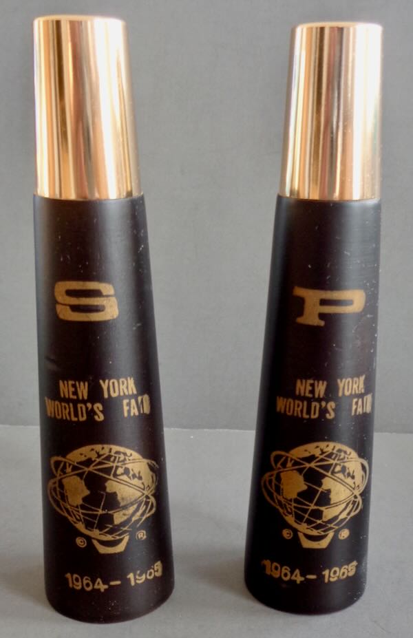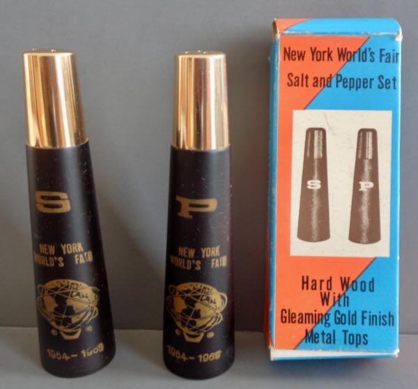 Wooden Salt & Pepper Shaker in the Original Box. Both shakers are tapered and picture in gold the Unisphere with the © to the left and ® to the right. Above is "New York World's Fair" with "1964-1965" below. One is marked 'S' and the other 'P'. Each has a gold colored top. There is a plastic plug in the bottom of each. The box is printed in orange and blue with pictures of the S&P on the box along with "New York World's Fair", "Salt and Pepper Set". The box is also marked "Hard Wood with Gleaming Fold Finish Metal Tops". Size: Box is 2" wide by 1 1/4" deep by 5 1/4" tall. Condition: S&P are Mint. The box is Extremely Fine with a little wear on the edges.