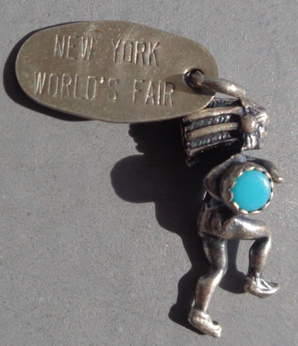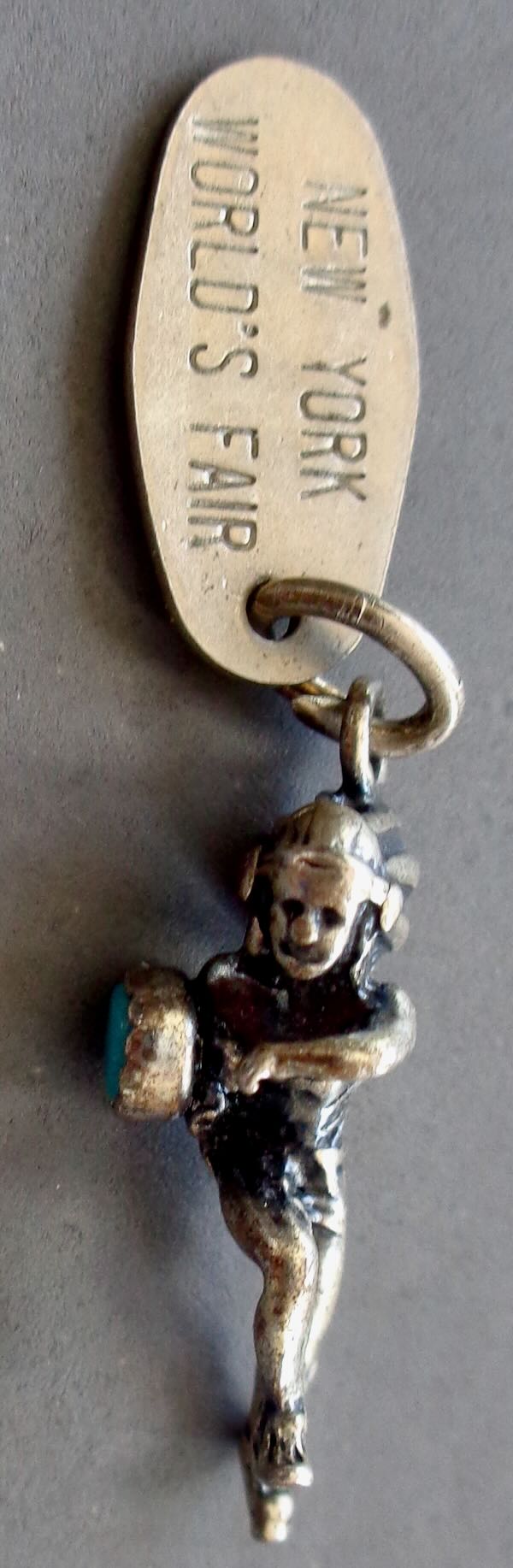1964 New York World's Fair Small Native American figure holding a drum with a blue plastic top. Attached to the loop at the top of the figure is an oval tag with "New York World's Fair" etched in it. I am not sure what pavilion sold this, possibly Montana or another western state. Uncommon, Size: The figure is 3/4" tall and the tag is 5/8" wide. Condition: Excellent.
