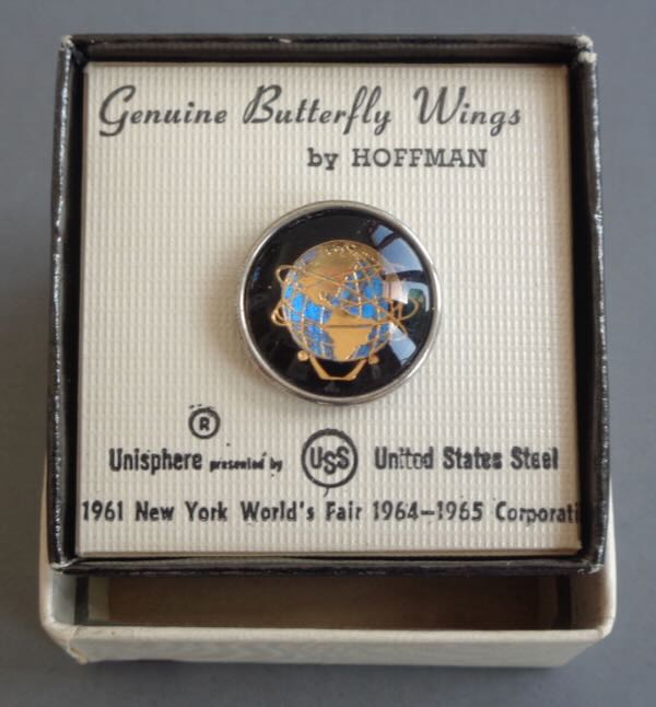 1964 New York World's Fair "Genuine Butterfly Wings" Tie Tack or Lapel Pin in the Original Box. The Unisphere is surrounded by black with butterfly wing colors behind the continents. Made "by Hoffman". Size: The pin is 5/8" diameter. The box is 1 1/4" square. Condition: Mint in original box.