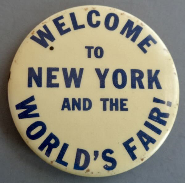 1964 New York World's Fair Celluloid Pinback "Welcome to New York and the World's Fair !" printed in blue on a white background. Size: 2 1/8" diameter. Condition: Very Fine, many tiny spots on the edge.