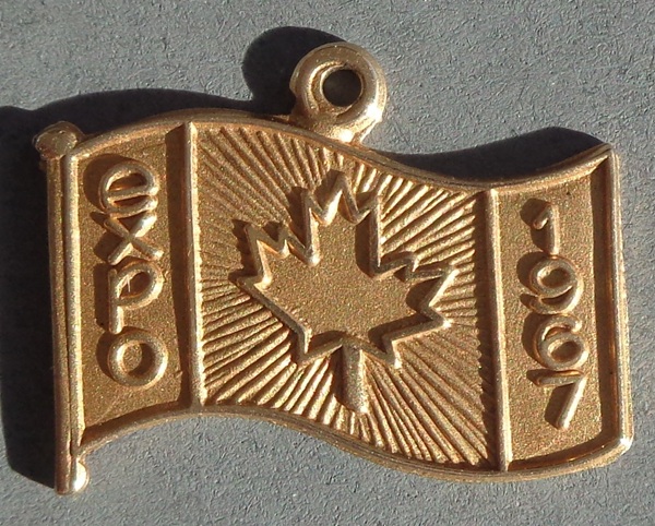 Expo 67 - Montreal Small 14 Karat Gold Charm in the shape of a flag with "Expo" on the left, "1967" on the right and a maple leaf in the center. Weight 1.6 grams. Size: 5/8" wide by 1/2" high. Condition: Near Mint.