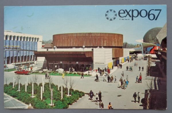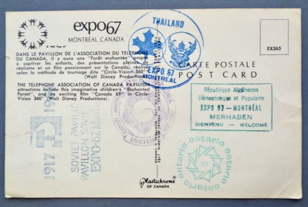 Expo 67 - Montreal Unused Postcards picturing "The Telephone Association of Canada Pavilion" (as marked on the back) with the stamps (not postage stamps, stamps that would be placed into the passport season ticket) from several pavilions. The stamps on the back including "Thailand", "Soviet Pavilion", "Algerienne" & "Ontario". The picture is a color photograph. Size: 5 7/16" wide by 3 7/16" high. Condition: Excellent.