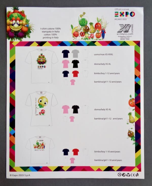 Modern Fairs Single page advertising the 3 different Tee Shirts that were produced for the Milan 2015 Fair. Printed in multicolor on glossy heavy stock, the edges are decorated with the logo vegetable figures. Next to the Tee Shirt designs are the colors and the sizes that are available. Size: 8 5/8" wide by 10 7/8" high. Condition: Near Mint.