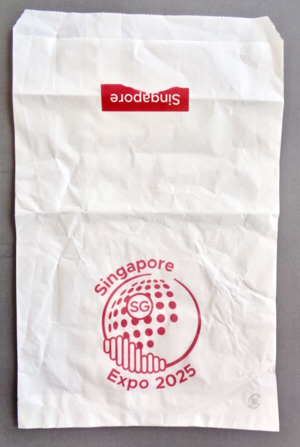 Modern Fairs Paper Store Bag from "Singapore" pavilion at "Expo 2025" printed in red on a white bag. Size: 6" wide by 9 1/2" high. Condition: Fine, the bag is creased and the Singapore tag to close it is torn.