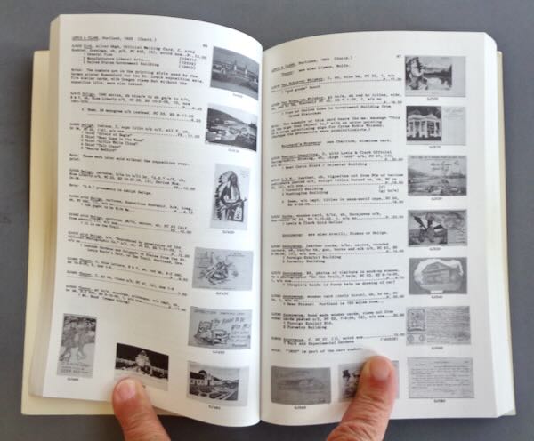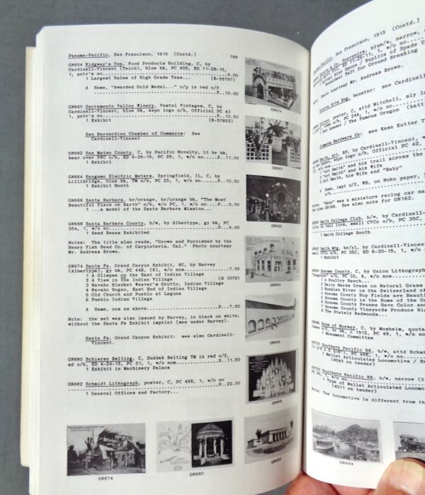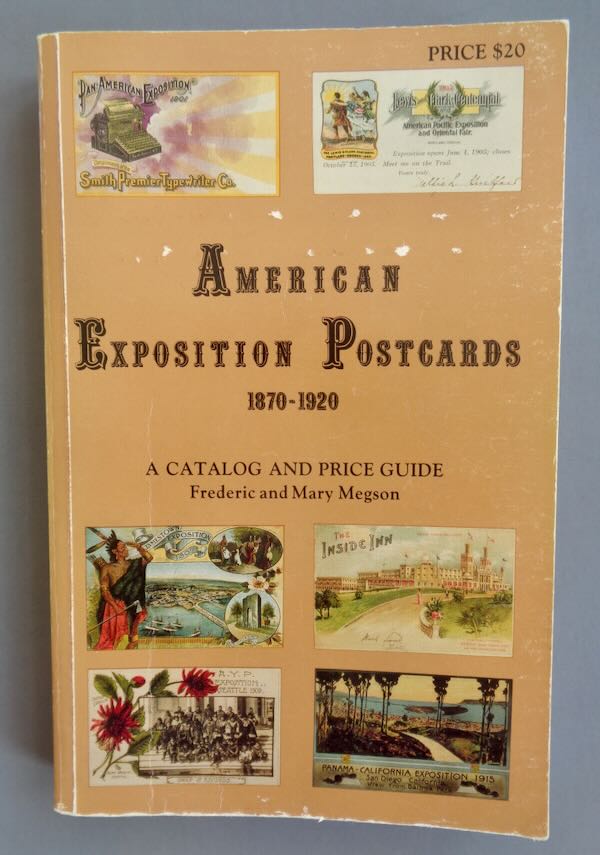 Modern Reference "American Exposition Postcards 1870 - 1920", "A catalog and price guide" by "Frederic and Mary Megson". This soft cover book contains 285 pages listing the postcards in chronological order by fair. Many of the listings have a small black and white photo of the card next to the listing. There are probably over 1000 cards listed. In the back are samples of all the markings to show they are postcards, a list of all the publishers and an index to help you find a specific card faster. Size: 5 1/2" wide by 8 1/2" high. Condition: Very Fine, a little paper loss on the cover and wear to the cover edges. The insides are clean with very light toning of the pages.