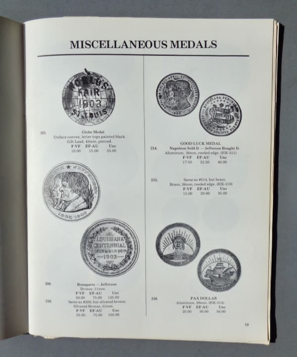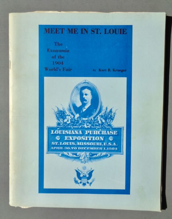 Modern Reference Paperback Book, "Meet me in St. Louie", "The Exonumia of the 1904 World's Fair" by "Kurt R. Krueger". Published in 1979. Inside are 88 pages of black and white pictures of medals, badges, elongates, pin backs, mirrors, fobs and more. With every description is a list of 3 values based on condition. Size: 8 3/8" wide by 10 3/4" high. Condition: Very Good since pages 61 & 62 are not attached and appear to have been copied from another book. The spine and the insides are a little darkened.