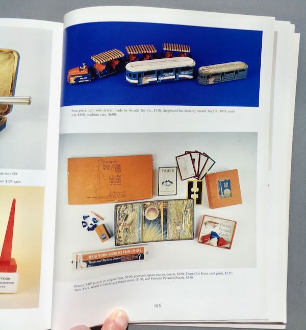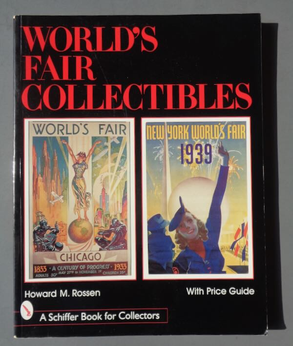 Modern Reference "World's Fair Collectibles" soft cover book covering the souvenirs from the 1933 Century of Progress and the 1939 New York World's Fair. Inside are 158 pages of color photographs of the souvenirs with a short description and a value. (Note: It has always seemed to me that the values were high on the objects the writer owned and low on the objects the writer hoped to obtain for his collection.) Howard Rossen wrote the book and it is autographed on the inside cover to the consignor. An Excellent reference book if you want to see what else is available to collect. Size: 8 1/2" wide by 11" high. Condition: Excellent.