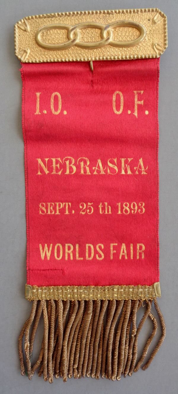 1893 World's Columbian Exposition Badge for "I.O.O.F.", "Nebraska" Day, "Sept. 25 th 1893", "World's Fair". The top bar has the 3 connected rings that is the IOOF logo. The bottom has brass fringes. Size: 2 11/16" wide by 6 3/4" high. Condition: Very Fine, with a 3/4" tear on the left near the bottom. The brass fringe is darkened and has a little tinpest.