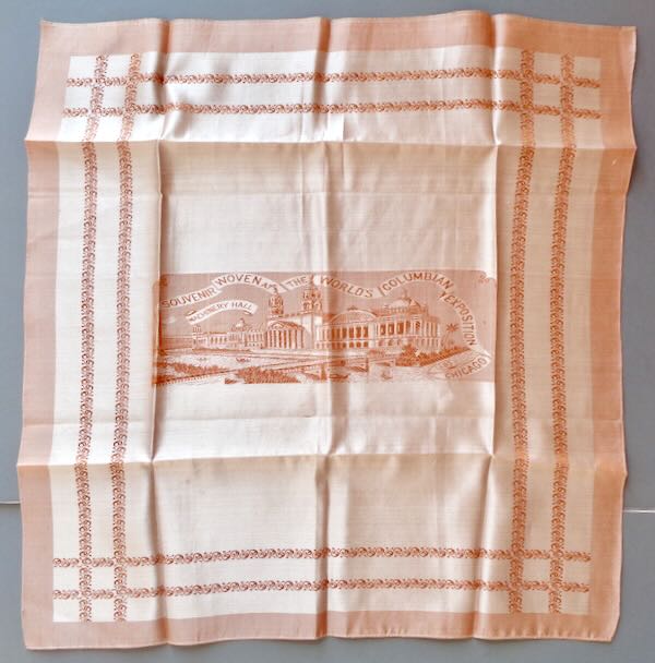 1893 World's Columbian Exposition Woven Silk Scarf or Handkerchief with the image of "Machinery Hall" with "Souvenir Woven at the World's Columbian Exposition" above the building and "1893 Chicago" below in the right corner. Around the image are 2 lines of decoration along with a border around the edge. Size: 20 1/2" wide by 21 1/2" high. Condition: Near Mint.