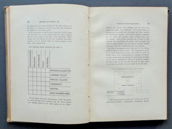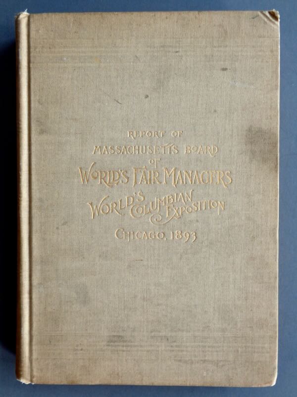 1893 World's Columbian Exposition Hard Covered Book, "Report of Massachusetts Board of World's Fair Managers World's Columbian Exposition, Chicago 1893". The 246 pages include 17 black and white photographs of their exhibits along with short chapters on multiple subjects including: State Building, Horticulture, Fine Arts, The Rumford Kitchen, Education and too many more to list. Size: 7" wide by 10" high. Condition: Very Fine, the cover is stained. The pages are nice and clean and the photos are undamaged.