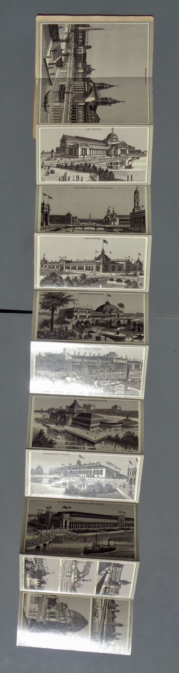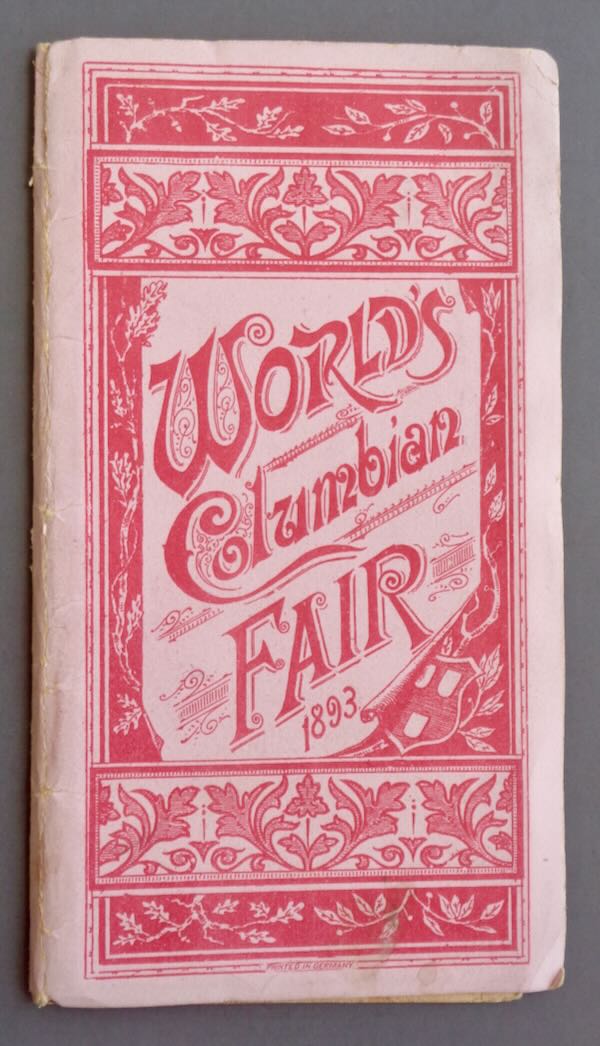 1893 World's Columbian Exposition Paper covered folder "World's Columbian Fair 1893" printed in red. Inside contains a foldout of 14 sepia pictures of the fair buildings along with the building name. Size: 3 3/4" wide by 6 7/8" high. Condition: Extremely Fine, some wear on the cover.