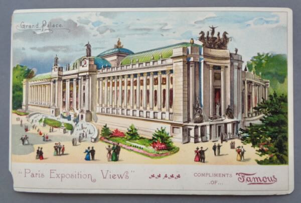 1900 Paris International Exposition Multicolor Chromolithograph card picturing "Grand Palace" with people outside the building. This card is from the "Paris Exposition Views" series marked as "Compliments of Famous" (this is not Famous Amos). This card could have been used as a postcard since the back is totally blank. Size: 5 1/2" wide by 3 1/2" high. Condition: Very Fine, The colors are brilliant but the corners are slightly rounded and damage to the lower left corner.