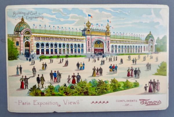 1900 Paris International Exposition Multicolor Chromolithograph card picturing the "Building of Civil Engineering" with people in front. This card is from the "Paris Exposition Views" series marked as "Compliments of Famous" (this is not Famous Amos). This card could have been used as a postcard since the back is totally blank. Size: 5 1/2" wide by 3 1/2" high. Condition: Very Fine, The colors are brilliant but the corners are a bit rounded and there is a little dent in the bottom edge.