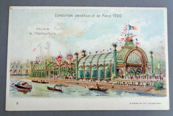 1900 Paris International Exposition Multicolor Postcard picturing the "Palais de l'Horticulture". Across the top is "Exposition Universelle de Paris 1900". The pavilion is pictured with the French flag flying above and boats in the Seine in the foreground. The card was published by "B. Sirven, Imp. Edit. Toulouse - Paris". Size: 5 1/2" wide by 3 1/2" high. Condition: Excellent.
