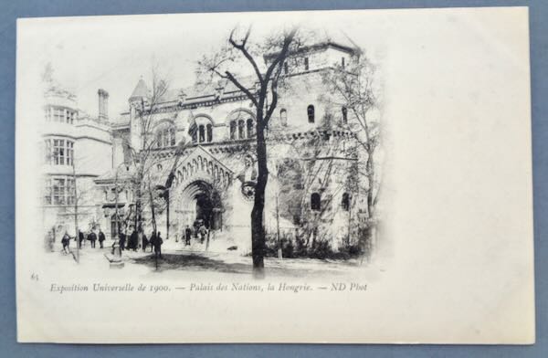 1900 Paris International Exposition Postcard of "Exposition Universelle de 1900 - Palais des Nations, la Hongrie. - ND Phot" picturing the front of the Hungarian Pavilion in black and white. On the left is the number "65". Size: 5 1/2" wide by 3 1/2" high. Condition: Excellent.