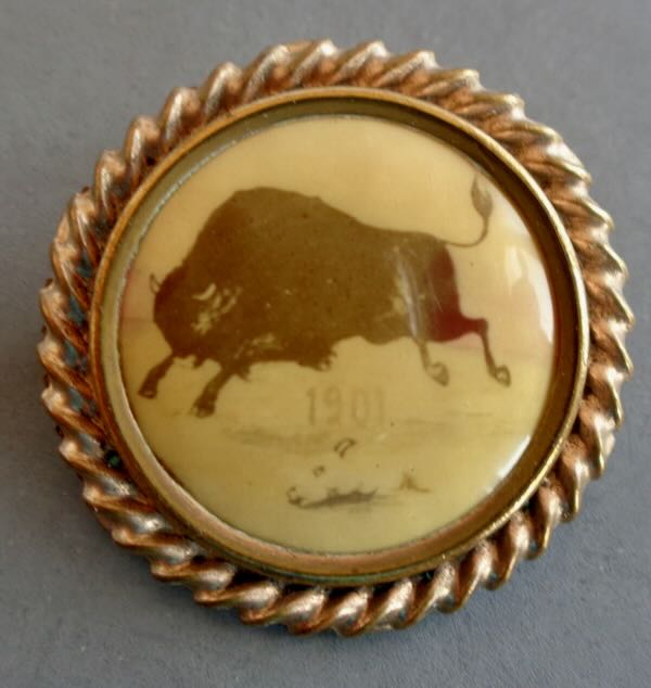 1901 Pan-American Exposition Brass surround Pin Back with a Sepia Celluloid center picturing a Buffalo running above "1901" with an animal skull at the bottom. (Lavin Similar PB27) Size: 1 1/8" diameter. Condition: Fine, the celluloid is faded.
