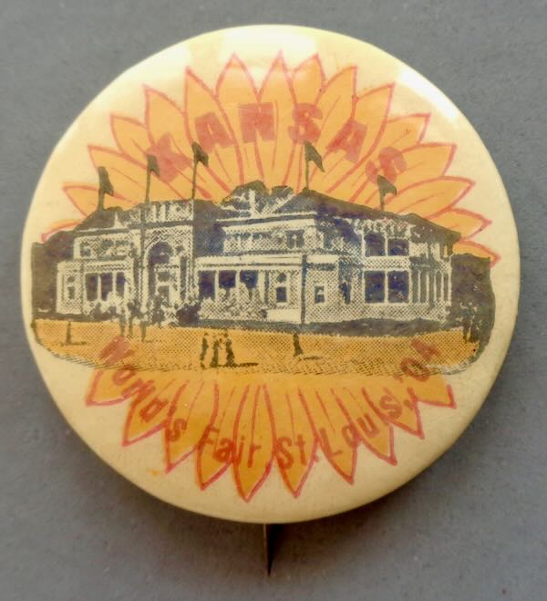 1904 St. Louis World's Fair Celluloid Pinback picturing in black the "Kansas" pavilion with a yellow flower around it. At the bottom in red is "World's Fair St. Louis '04". Size: 1 1/4" diameter. Condition: Excellent.