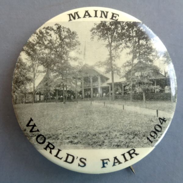 1904 St. Louis World's Fair Celluloid Pinback with "Maine" around top, "World's Fair" around the bottom and the state's pavilion pictured in the center. The button is printed in black on white. (RLH 39-1790) Size: 1 3/4" diameter. Condition: Near Mint.