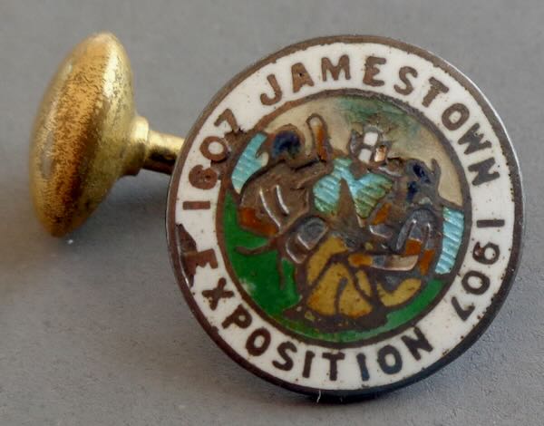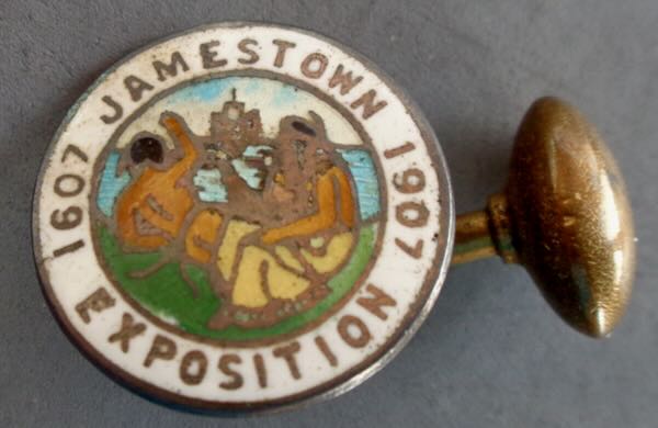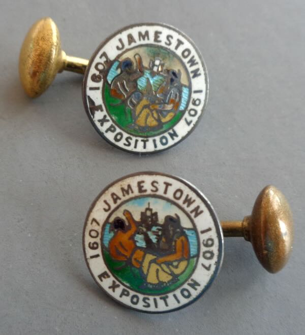 1907 Jamestown Exposition Pair of Cufflinks with Baked Enamel tops. The image on the top has two Native Americans waiving at an approaching ship. Around the edge is "1607 Jamestown 1907" with "Exposition" at the bottom. The picture is green, white, turquoise, yellow and brown. Size: Top is 5/8" diameter with the overall length to the bottom is 15/16". Condition: One is Extremely Fine with a small crack. The other is Very Good with missing enamel in the center and on the edge at 8 o'clock.