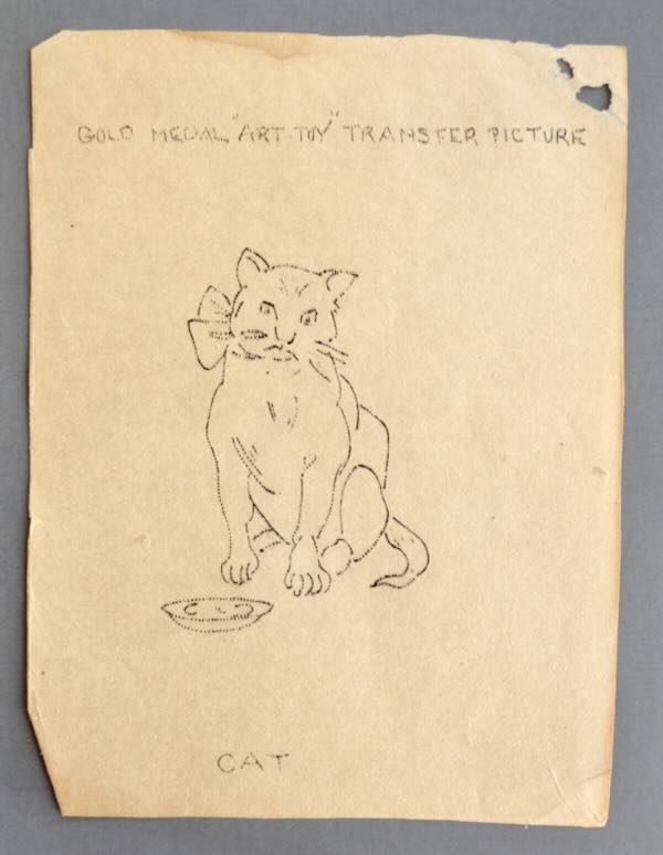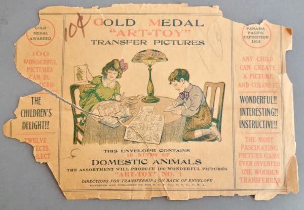 1915 San Francisco's Panama-Pacific International Exposition "Gold Medal 'ART-TOY' Transfer Pictures". This is a tracing toy that won the gold medal at the PPIE. The cover pictures a boy and a girl tracing the pictures. Inside are over 14 pictures and tracing paper to trace the pictures. Size: The pictures are 4 1/4" wide by 5 7/8" high. Condition: Poor. The covers are torn and missing parts. Most of the tracing paper has been used to trace the pictures.